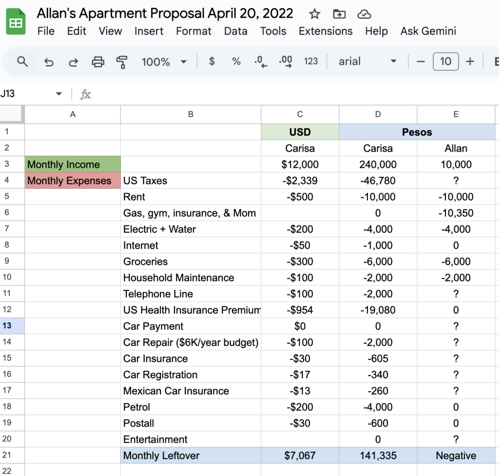 “It’s not too complex to explain. I need to assure $10,350 per month to cover gas, the gymnasium, an insurance bill and two things I bought for my mother’s place and I committed to pay every month for the next 24 months. So, right now I can pay 50% for the rent (whenever we agree), I would pay electricity and water, you could pay for INTERNET, I would buy the groceries two weeks per one week you do it and we can go 50-50 with maintenance, utilities, etc. Each one would be responsible for the own car.”