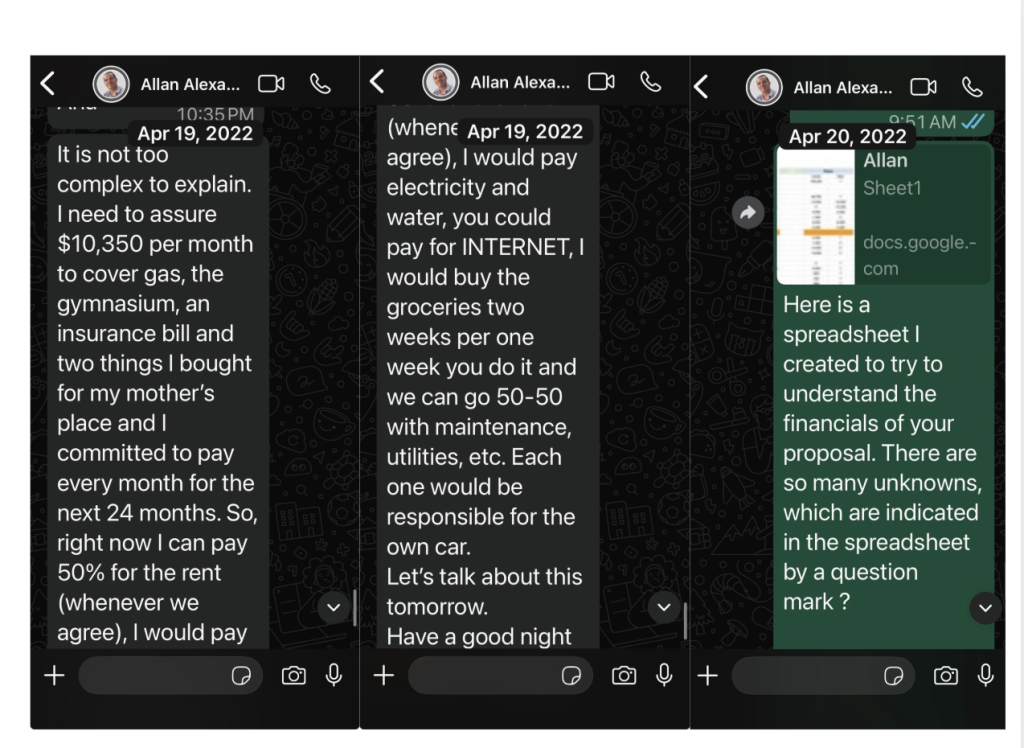 Allan, you claimed I wanted financial support from you in La Paz. The record disproves that. On April 19, 2022, you offered to pay 50 percent of rent and proposed a proportional split of nearly all other expenses, except your gym membership.
